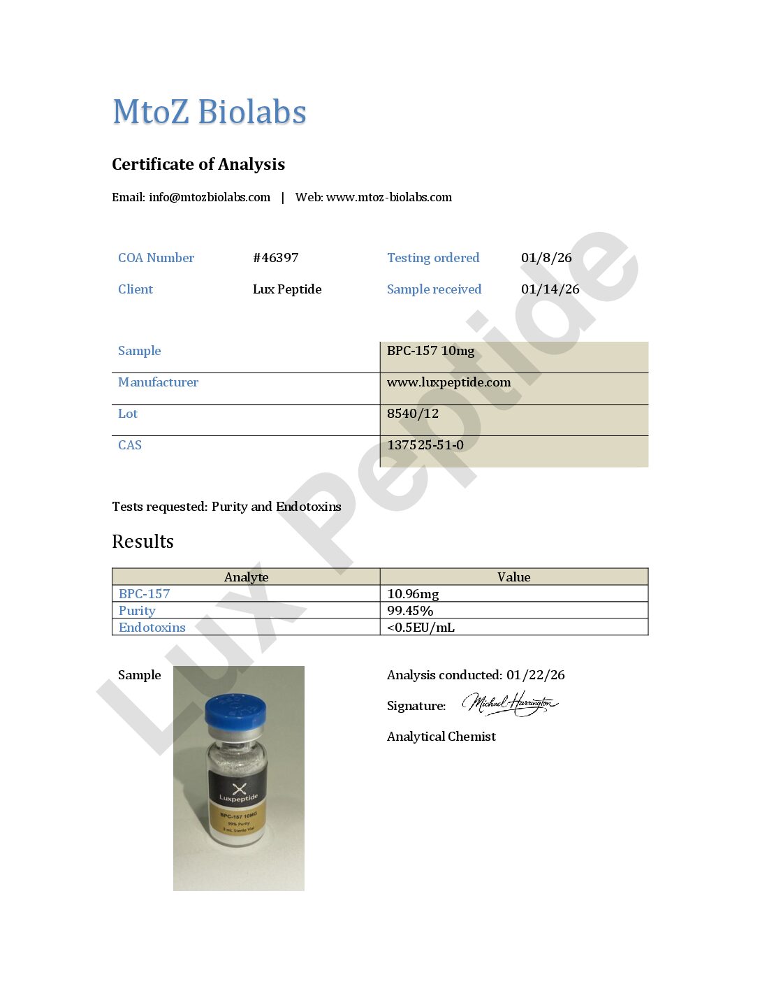 In research settings, BPC-157 has been examined for its interaction with cellular communication pathways and its role in modulating signaling processes related to structural integrity and cellular response mechanisms. Due to its stability across a range of experimental conditions, it is often incorporated into studies requiring reliable peptide performance and consistent bioactivity.