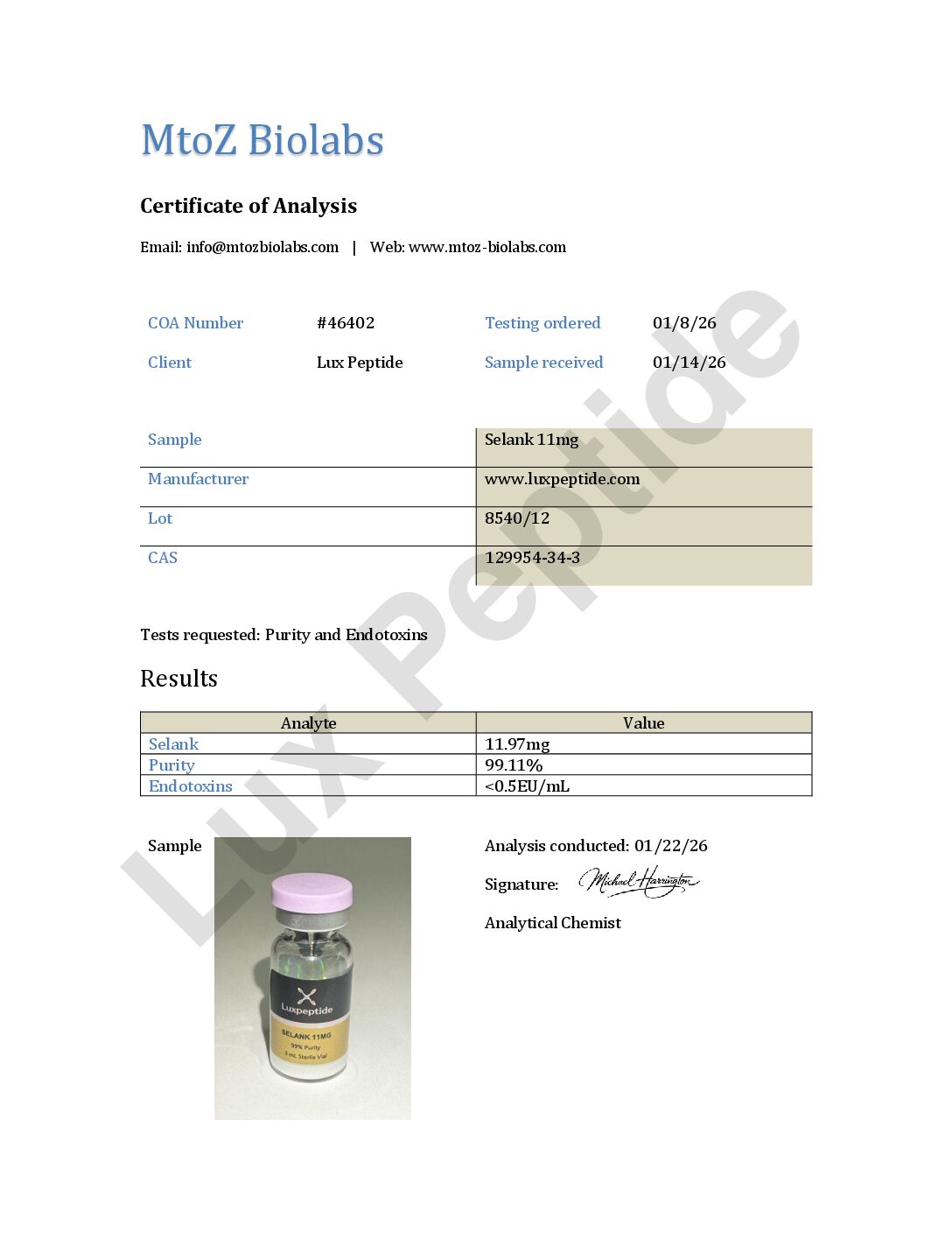 Selank is a synthetic heptapeptide derived from the endogenous immunopeptide tuftsin and is widely utilized in laboratory and preclinical research involving neurochemical signaling and peptide-receptor interactions. Its defined amino acid sequence and structural stability make it a frequent selection in studies focused on central nervous system pathways.