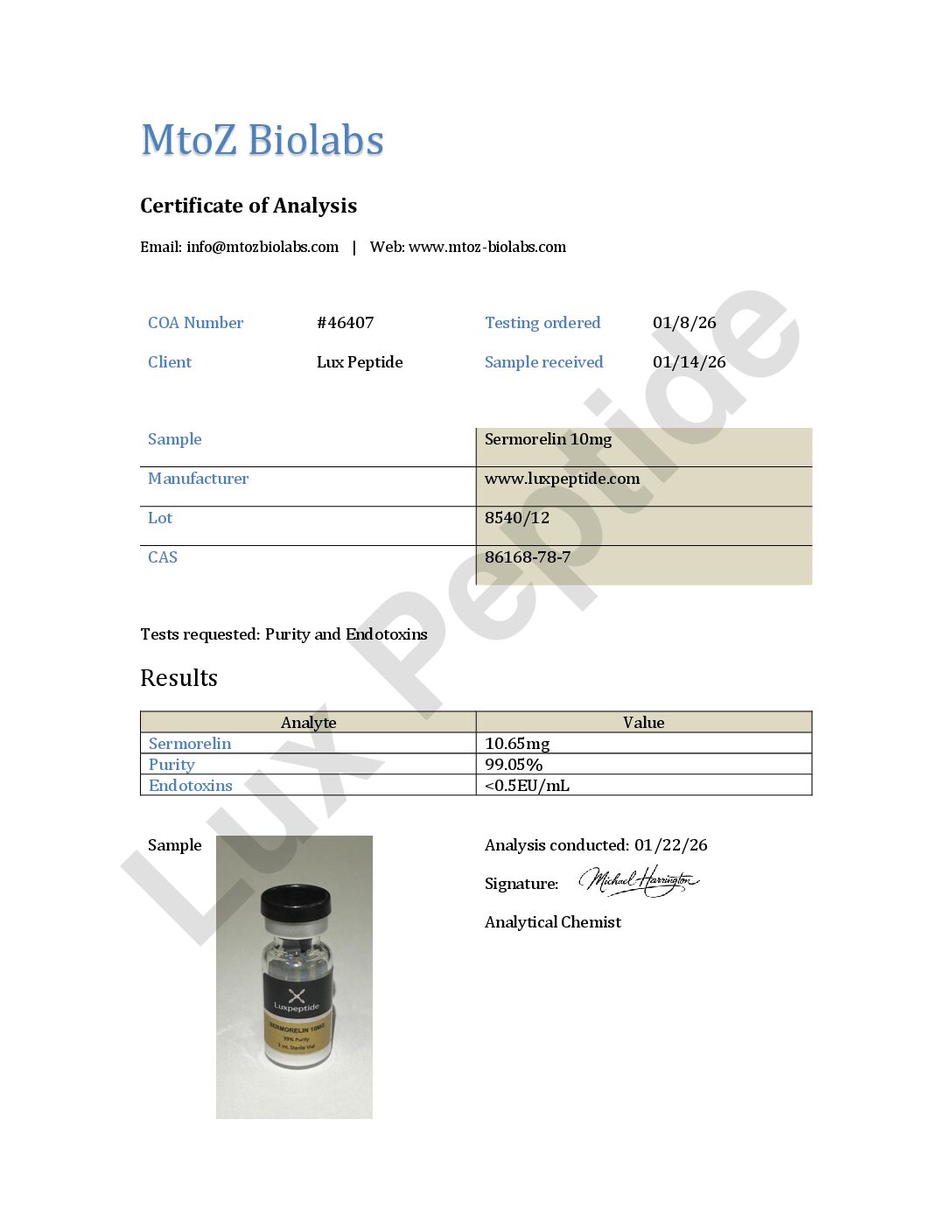 Sermorelin is a synthetic peptide analog of growth hormone–releasing hormone (GHRH 1–29) and is commonly utilized in laboratory and preclinical research examining growth hormone signaling pathways and endocrine communication. Due to its well-defined amino acid sequence, Sermorelin is frequently selected for controlled studies involving peptide-receptor interactions and pulsatile signaling dynamics.
